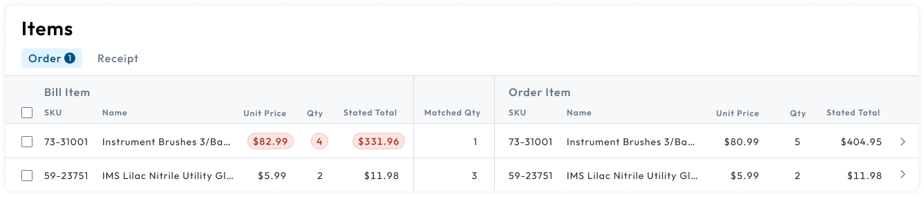 - Unit Price: The bill item's unit price is greater than the order item's unit price.
