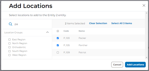 - In the Add Locations modal, you can select the Location or Location(s) that you would like to add by checking the corresponding box.