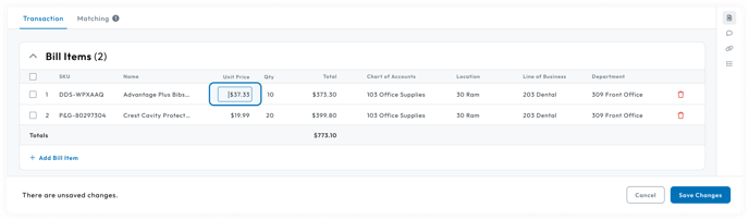 - Update the unit price of the bill item in the table.