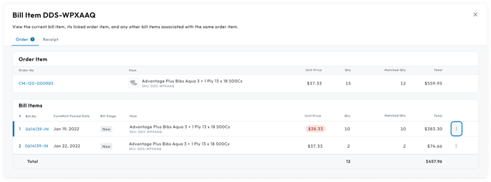 - Click on the Menu icon in the Bill Item’s table row