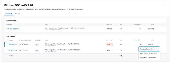 It's important to view the unit price variance between the bill item and the order item to ensure you don't overpay the vendor. To review the unit price exception: