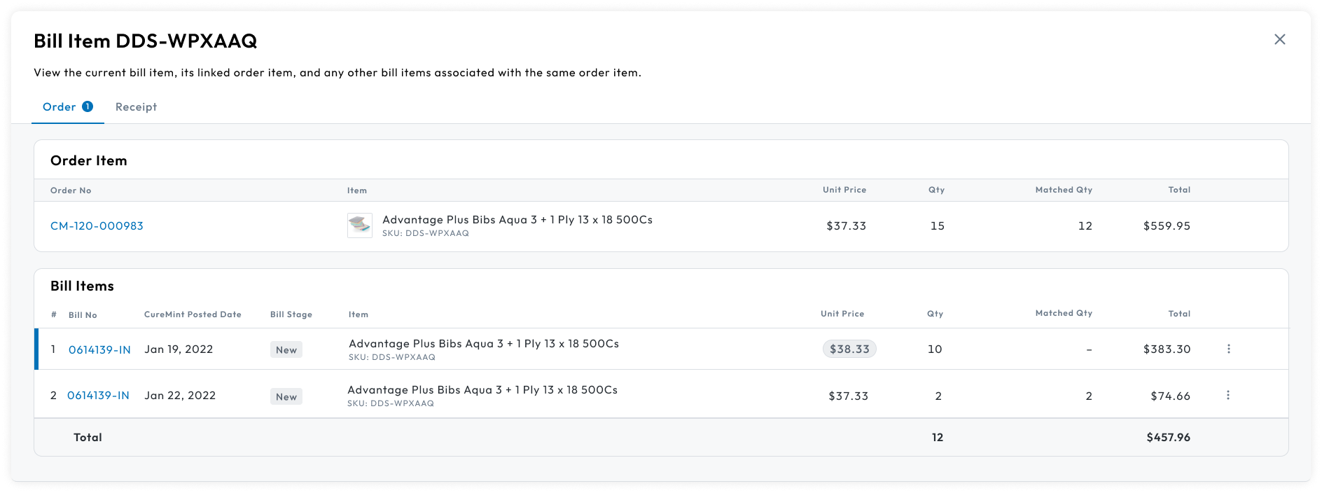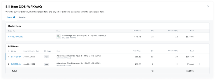 - The modal lists all bill items in order of the bill’s created date that are connected to the linked order that have a bill item connected to the same order item of the current bill item that has the unit price issue.