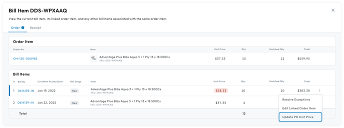 If you determine that the unit price on the bill is correct and the unit price on the order was incorrect, you can update the unit price on the order to match the bill.