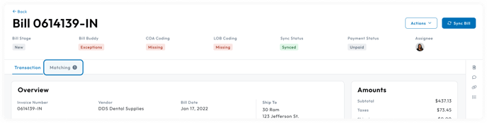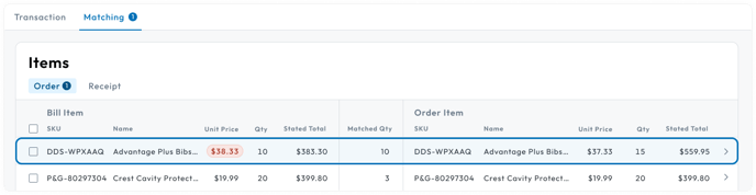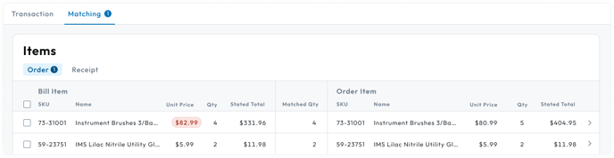 It is displayed on the Matching Tab under the Order section with an error badge around the bill item’s unit price.
