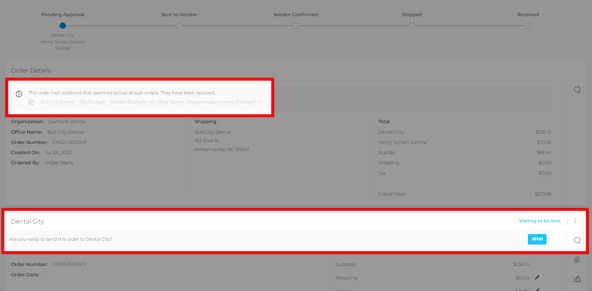 Now that the order no longer violates an Order Rule, the order status has changed from "Pending Approval" to "Waiting to be Sent" and the approver has the option to manually send by selecting the blue Send button seen in the image above. Clicking Send will send the order directly to the vendor to be processed.