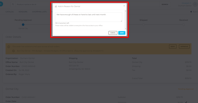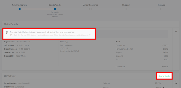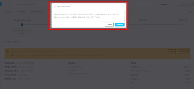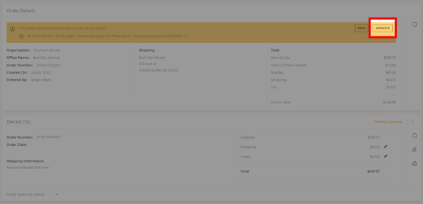 In that example, an order rule was created that required approval for any orders placed after the Bull City Dental office had spent 75% of their monthly allotted budget.