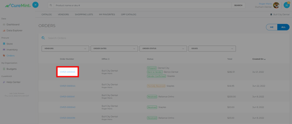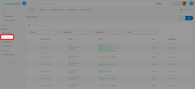 Once you have placed an order in CureMint, you can view your Order History by visiting the Orders under the Procure in the left-side panel menu.