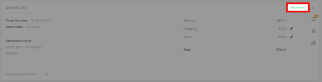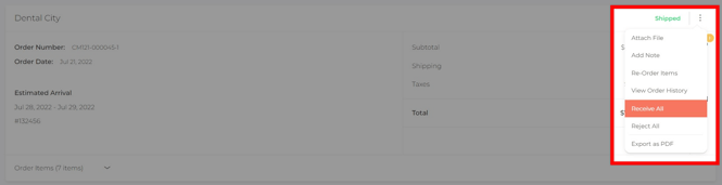 In this example, if your Dental City order has been delivered in its entirety, you can update the whole order by clicking the three dots in the upper-right corner of the Dental City section and selecting ‘Receive All.’