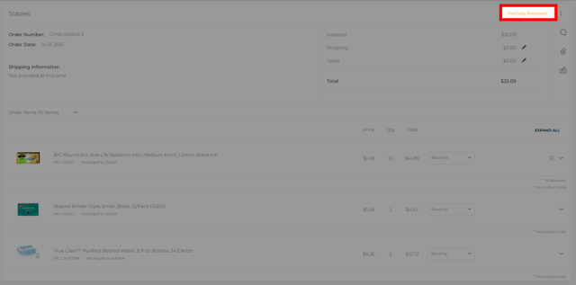 Partially Received: Part of the order has been delivered to the office and members of your team have marked those items as 'Received' in CureMint.