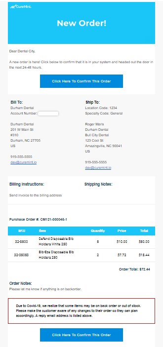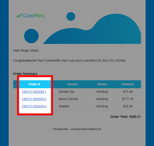 When you place an order through CureMint, the order is sent to your vendor(s) either via email or via API integration.